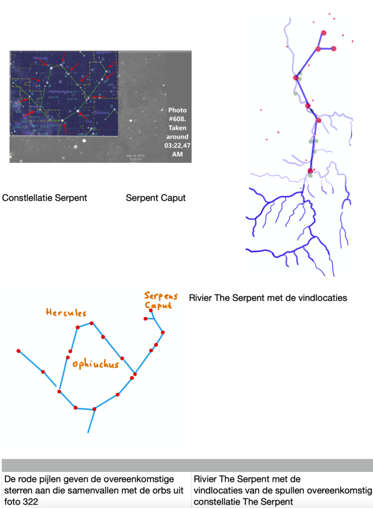 Op de serie foto’s die gepubliceerd zijn van zowel de telefoons van Kris en Lisanne als van de Canoncamera is al veel over gezegd, gespeculeerd en er is gedegen onderzoek naar gedaan door experts. Toch is er een gevoel dat het niet helemaal zuiver is. Het meest in het oog springend was voor mij foto nummer 608, deze was namelijk gemaakt om 03,22 uur en daar moest haast iets mee zijn. Dit moest een aanwijzing bevatten. 3 2 2 komt niet voor niets voorbij. Op de donkere (flits)foto zie je weinig meer dan enkele lijnen die op bomen lijken in de nacht met op de voorgrond witte stipjes waarvan snel gedacht wordt dat het door de flitser oplichtende regendruppels zijn. Mijn eerste gedachte was meteen dat het orbs waren. Deze intelligente energiefenomenen komen op veel plaatsen voor en hebben vaak een boodschap te vertellen. Ze manifesteren zich op bijzonder positieve en vrolijke plaatsen maar kunnen ook voorkomen op plaatsen waar verdriet aanwezig is. Op de foto blijkt er een patroon te ontdekken in de manifestatie van de orbs. Het lijkt erg op de constellatie de Serpent, het 13e sterrenbeeld van de dierenriem.