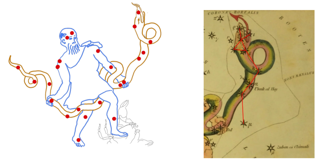Zie hoe de Slangendrager met zijn linker voet op de schorpioen/kreeft staat. De kop van de slang in de vorm van een X.