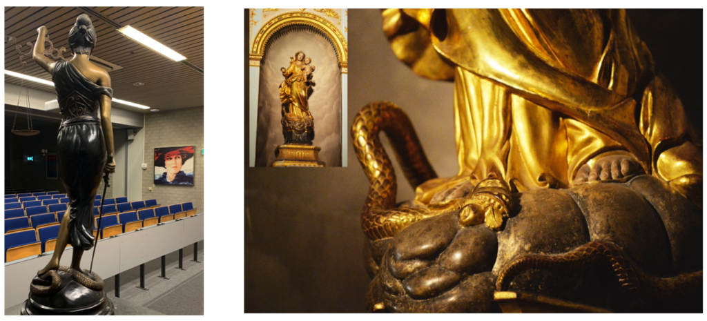 Nu is onder de machthebbers op ons wereldtoneel een van de invloedrijkste de Rooms-Katholieke kerk met de hoofdzetel in Vaticaanstad. Vati-can betekend letterlijk de aanbidding van de slang. De slang speelt ook een hoofdrol in het Genesis verhaal 3:22. Deze biedt de giftige appel aan Eva aan waarna de mensheid in een slaaptoestand geraakte. Vaak zien we ook beeltenissen van Vrouwe Justitia die met haar linker voet een slang bedwingt, evenals Maria beeltenissen.