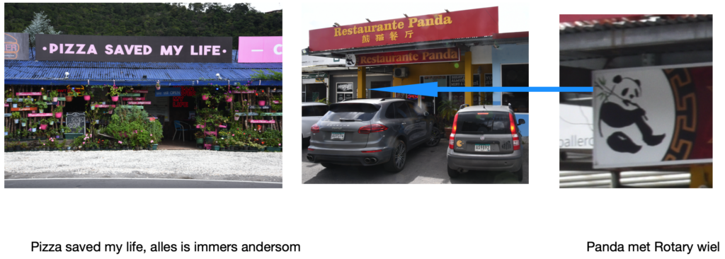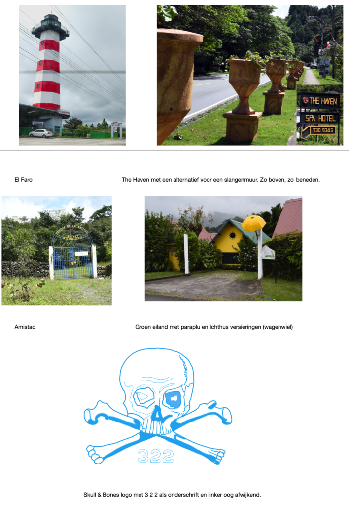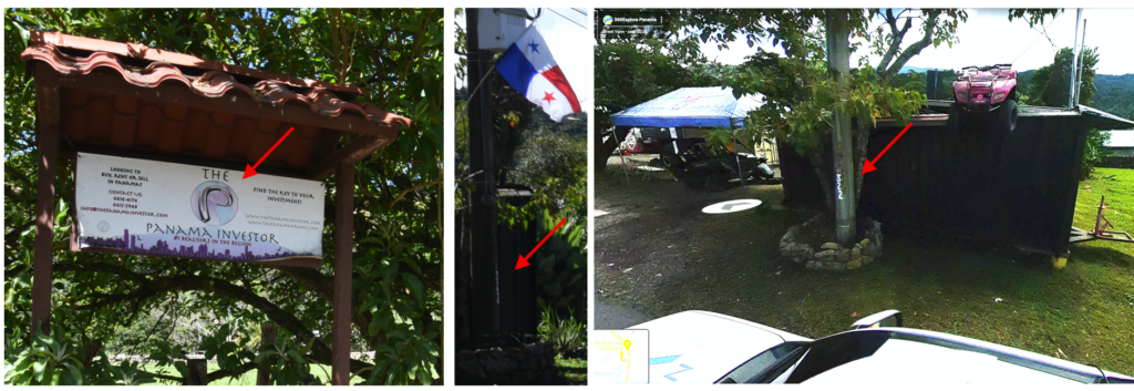 Ik loop parallel aan de hoofdstraat en passeer een Evangelische kerk op nummer 32 met een grote ruwe kei voor de deur, precies in lijn met een opvallend, groot, wit kruis op een berg wat vanuit het hele dorp te zien is. Even verder op loop ik een braakliggend veldje voorbij en in mijn ooghoek zie ik een opvallend bord staan met logo in de onopvallende vorm van een bokkehoorn en/of ronde slang. Voor mij te opvallend om niet op te merken. Het is van ThePanamainvestors_com. Als ik verder loop zie ik een andere kerk die ik wil fotograferen met een grote, ruwe kei op de voorgrond en daarbij valt een groot wit nummer 320 op wat het nummer is van de lantaarnpaal. Hmm. Even terug en wat blijkt? Het perceel wordt begrensd door lantaarnpaalnummers 320, 321 en 322. Op de site is het duidelijk dat het logo een verwijzing is naar de slang en/of bokkenhoorn. Ook CÂsa (Casa met een ^) Solutions staat op de site.