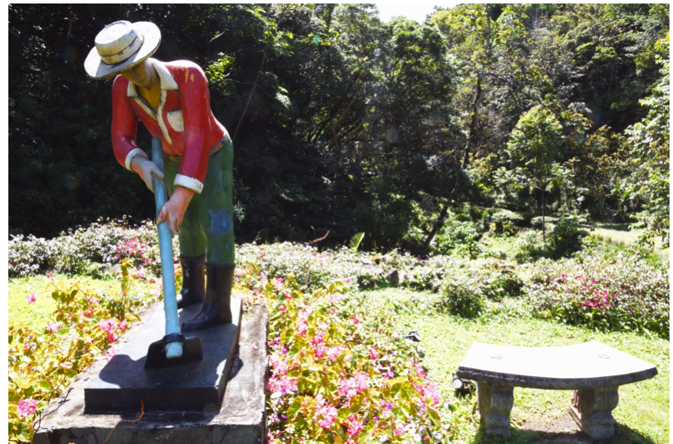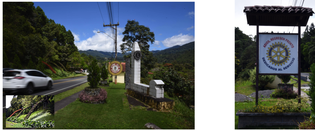 Een dag later voel ik me beter maar ik heb nog wel een vervelende knoop in mijn buik. Ik moet weten of de versnelde hartslag eenmalig was of dat ik actie moet ondernemen. Er zit maar een mogelijkheid op en dat is lopen en zo tegelijkertijd de omgeving van Boquete verkennen. Ik besluit een stuk bergopwaarts te gaan lopen om te zien of ik wederom zo ongemakkelijk presteer. Aan het begin van het dorp, aan het begin van de kom, hoogste punt en grens tussen Alto Boquete en Boquete in heb ik een groot monument van de Lions zien staan. Er bevindt zich tevens een mooi toeristisch uitkijkpunt nabij dus een mooi doel voor een wandeling. Ik ben in een vlot tempo naar boven gelopen en dat ging oke. Morgen durf ik met vertrouwen de El Pianista op. Ik ben via een begraafplaats heen gelopen en dit werd bij de entree ook versierd met een zuil van de Lions waar de plaatselijke overleden Lionsleden op staan. Een mooi blik op Allerzielen – 2 november. Aan de toegangsweg net voor de bebouwde kom vielen drie mooie bloemdecoraties op in de vorm van een putring op zijn kant waar de bloemen uit stromen. Drie bloemenfonteinen die uit een hoorn des overvloed stromen. Toen ik een foto nam zag ik dat dit net voor het monument van de Lions was. Meteen er achter was een nog een monument maar van de Rotary. Lions-twee leeuwenkoppen als logo en Rotary een zaagblad ofwel wagenwiel, rader, tandwiel. Dit zaagblad heb ik hier al meer gezien. Vanaf het toeristische uitkijkpunt ben ik door de hoge woonwijk teruggelopen. Hier is een spa-resort gevestigd en hebben als welkomstbeeld in de tuin een landarbeider in het rood, wit, zwart. Dit hoort duidelijk bij elkaar; Lions, Rotary, resort en de bloem- beeldwerken van arbeiders.