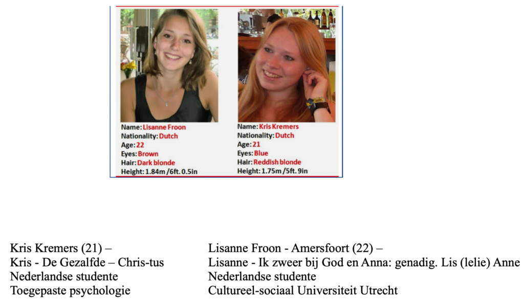 De slachtoffers: Twee jonge meiden zijn schijnbaar zonder enige aanleiding uit het dagelijkse leven weggenomen zonder enig spoor na te laten wat tot de toedracht leidde. Vooraf hebben ze niemand op de hoogte gesteld waar en wat ze gingen doen en ze waren ook niet voorbereid om er ‘extreem’ op uit te gaan. Ze waren als echte toeristen op dat moment op weg voor een daginvulling om de tijd plezierig door te komen na enkele tegenvallers in hun eigen programma. Ergens op hun toeristische pad is er een kink in de plannen gekomen die geleid heeft tot hun verdwijning. Slechts een klein aantal mensen wist van hun verblijf en van hun plannen op de dag van verdwijning zelf wist zelfs niemand iets. Zo is het verhaal! Tenzij … er bewust op een bepaald plan aangestuurd is.